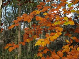 Beech – Fagus sylvatica. It is always a treat to see a beech tree in the late autumn/early winter. The oval shaped leaves have wavy edges, are various shades of green during spring and summer but then change to spectacular shades of yellow, orange and brown as winter approaches.