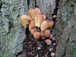 Glistening Inkcap – Coprinellus micaceus This mushroom has a smooth, shiny cap that glistens when wet. They can be found growing in clusters on decaying wood, tree stumps and fallen branches in damp woodlands at this time year.