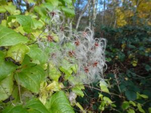 Traveller’s Joy – Clematis vitalba. Also commonly known as Old Man’s Beard, this climbing plant scrambles over hedgerows and woodland edges. During the summer months it produces masses of white, scented flowers but as autumn and winter arrive white fluffy seed heads appear, providing food for birds such as greenfinches and goldfinches.
