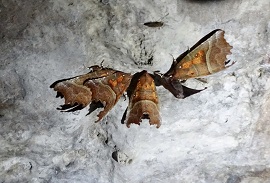 Herald Moth – Scoliopteryx libatrix. One of the easiest times to see a Herald Moth is between October and March when they are in hibernation. They spend this time on ceilings of dark places such as old buildings, cellars or caves, usually in small groups so looking for them with a torch would be helpful. These attractive moths are orange and brown in colour and resemble old shrivelled leaves.