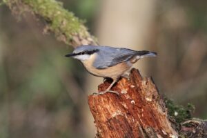 Nuthatch – Sitta europaea. These distinctive grey and apricot coloured birds are fascinating to watch as they are able to move both up and down tree trunks. They probe the bark with their strong pointed bills searching for insects, but also feed on nuts, seeds or berries. They enjoy sunflower seeds and peanuts and are known to visit bird tables especially in winter.